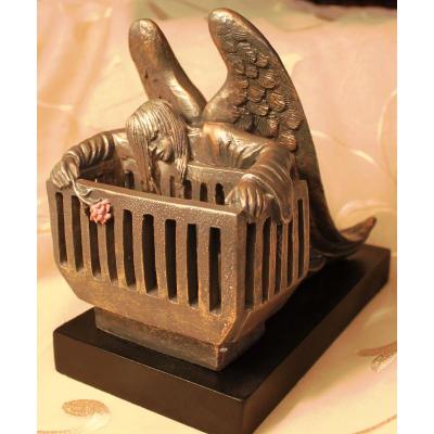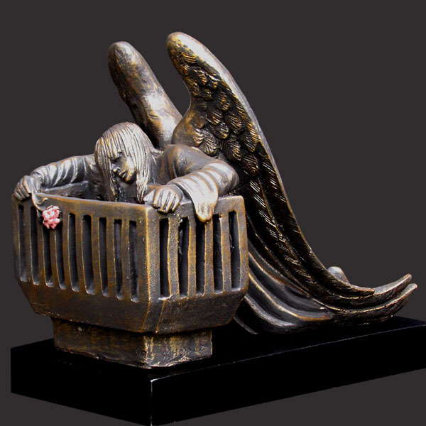An angel weeping over an empty cradle is a powerful image and a touching memorial to children. The statue is life-sized. It is pure bronze, 50" tall, 36" wide, 66" long and weighs over 700 pounds. This beautiful memorial was created by the Canadian sculptor, Timothy P. Schmalz. His goal in creating this monument was to give a face to child loss and honor the unborn.